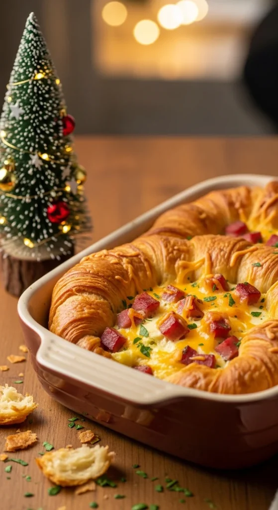Flaky croissants make this casserole feel special. Tear them up and layer with ham, cheese, and eggs. Let it soak overnight for extra softness. The result: buttery, custardy perfection. Perfect for a holiday brunch spread.