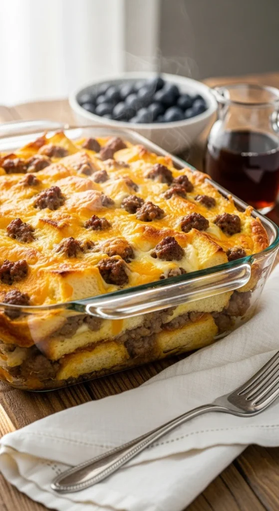 A timeless favorite. Whisk eggs, milk, and cheese, then layer with cooked sausage and bread cubes. Let it soak overnight and bake in the morning. The result is fluffy, savory perfection. Budget tip: use day-old bread and stretch the cheese for a filling meal that feeds many.