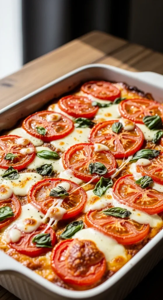 Bright and flavorful. Layer sliced tomatoes, basil, and mozzarella over eggs. Bake until bubbling. It’s Italian-inspired and feels fresh on the holiday table. Use cherry tomatoes for sweetness.