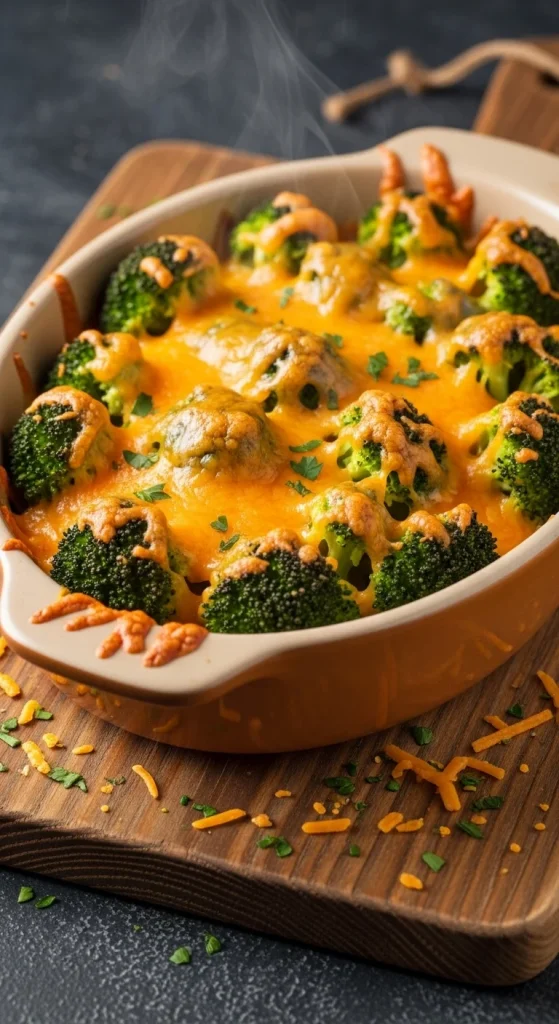 Cheesy and nutritious. Steam broccoli lightly, then mix with eggs, cheddar, and a splash of cream. Bake until firm and golden. A simple way to add greens to your holiday table.