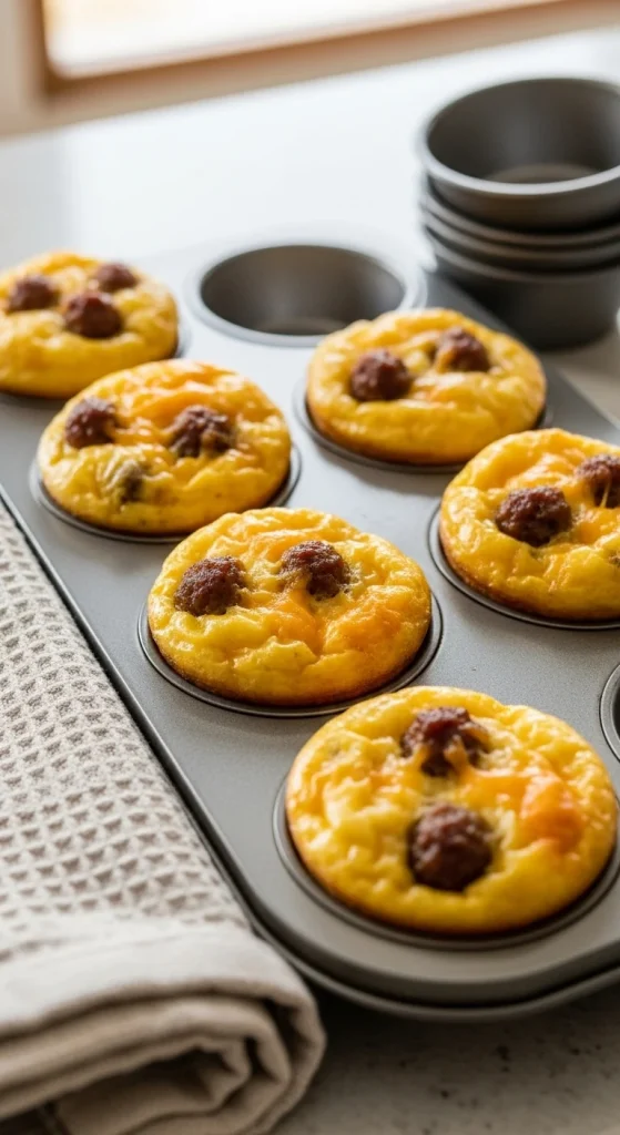 Whisk eggs with sausage and cheese, pour into muffin tins, and bake. These mini cups are easy to portion and reheat. Store leftovers in the fridge — they last for days. Perfect for busy holiday mornings.