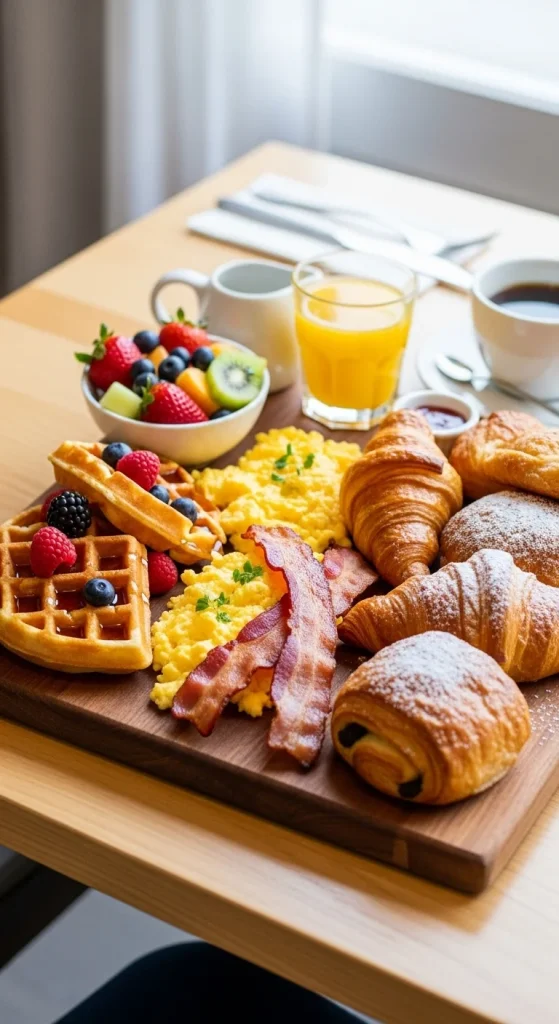 A fun way to serve a mix of favourites. Arrange cooked items like eggs, bacon, pastries, and fruit on one board. It looks amazing and makes serving effortless. Great for families or brunch-style breakfasts.