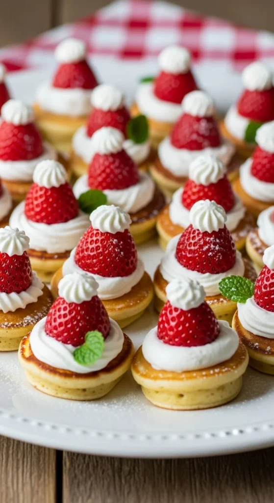 These adorable bites are perfect for kids. Stack mini pancakes, add whipped cream, and top with strawberries. They look festive and take minutes to make. Serve on skewers for easy grabbing — they’ll be gone fast!