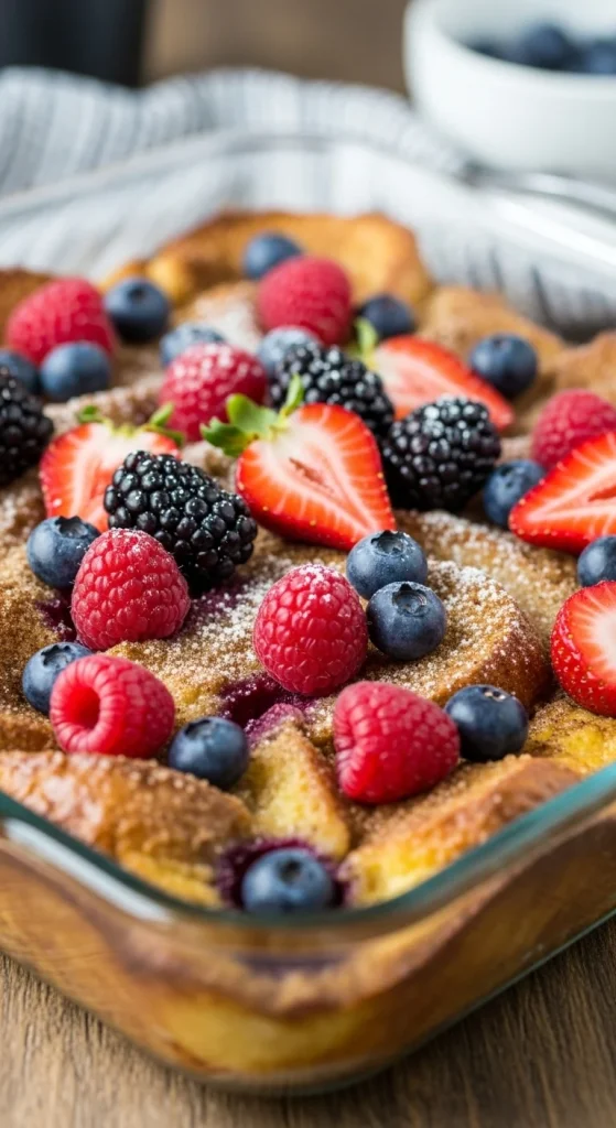 Cut up bread, soak it in egg mixture, and bake instead of frying. The result? Crispy edges, soft inside, and pure comfort. Add cinnamon and nutmeg for holiday spice. Serve with powdered sugar and warm syrup. It’s ideal for make-ahead mornings.