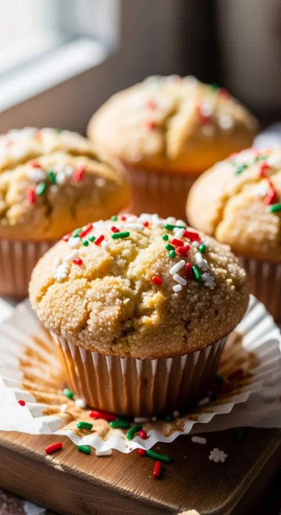 These muffins taste like soft sugar cookies with less effort. Add vanilla for warmth. If you want a holiday look, use red and green sprinkles on top. Only stir the batter until combined to keep the crumb tender. Serve these with milk for a cosy winter treat. They store well at room temperature for a day.