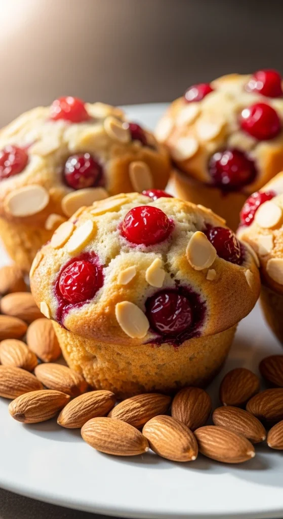 Cherries give these muffins a holiday glow. Use frozen cherries if fresh ones are pricey. Pat them dry before adding so the batter doesn’t turn wet. Almond extract adds flavour with only a few drops. Sprinkle sliced almonds on top for crunch. These muffins look fancy but use simple ingredients. Serve warm for a cosy treat.