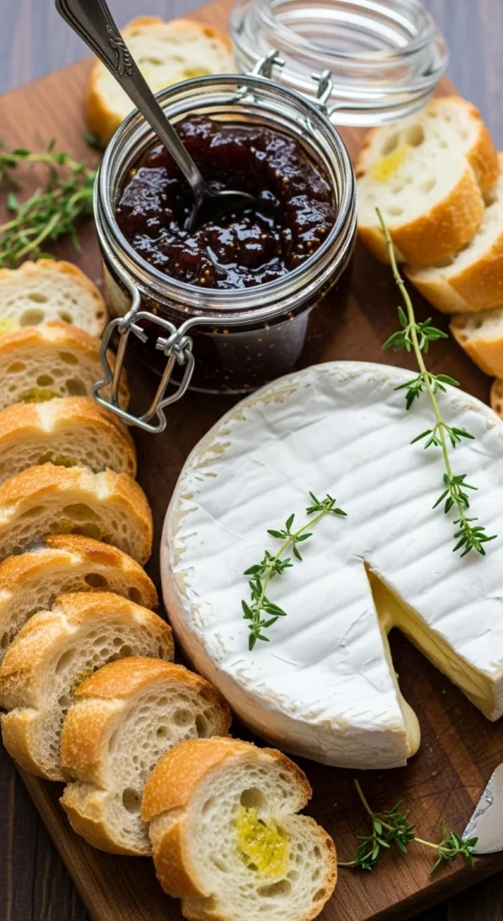A traditional choice, the Brie and fig jam combination brings a rich, creamy flavor paired with the sweetness of fig jam. The soft, melt-in-your-mouth Brie is the star of the show, and when served with fresh baguette slices, it provides the perfect balance of savory and sweet. Add a few sprigs of thyme to give it a touch of freshness.