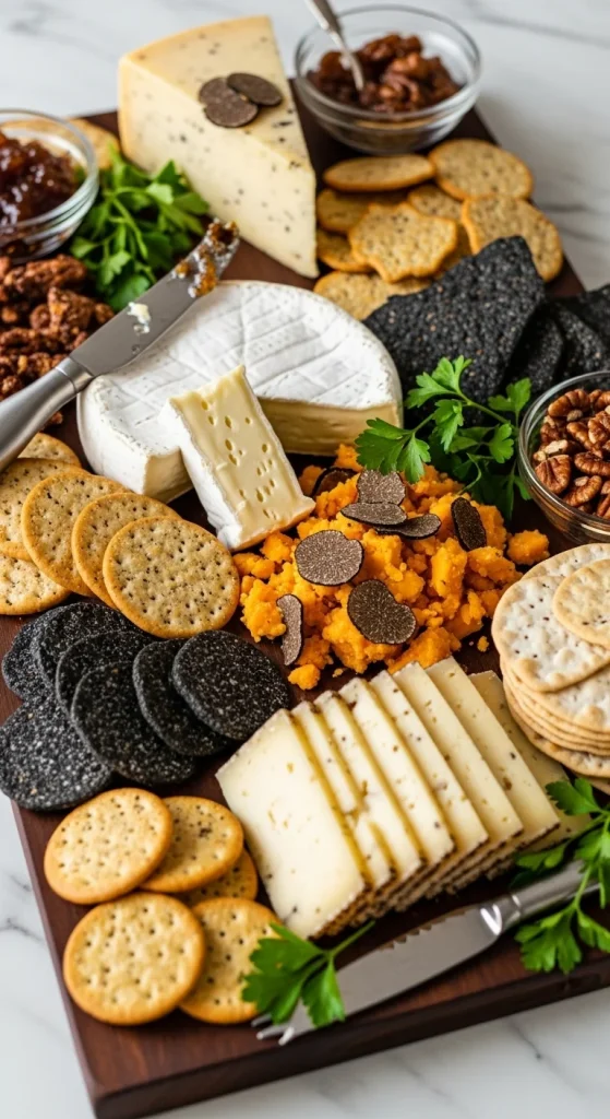 If you’re aiming to make your cheese board feel truly luxurious, opt for truffle-infused cheeses like truffle cheddar or truffle Brie. The earthy flavor of truffles pairs wonderfully with the creamy texture of the cheese. Keep the rest of the board simple with gourmet crackers and a few fresh herbs for garnish.