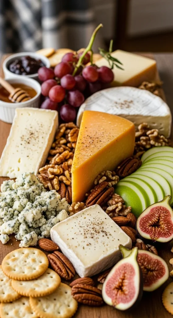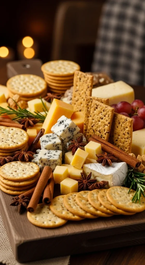 This board combines aged cheeses like cheddar and gouda, which pair perfectly with the warm spices of cinnamon and star anise. The spiced accents give the board a cozy, holiday vibe. Add a few fresh fruits like pears and apples, and you have a rich, festive spread that guests can nibble on all night.