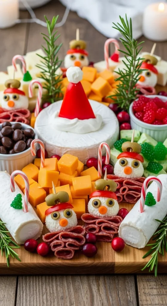 Create a Santa’s Workshop-inspired cheese board by using festive holiday-themed garnishes like mini Santa hats made from strawberries, candy canes, and chocolate-covered almonds. It’s a playful, family-friendly way to bring holiday cheer to your spread.