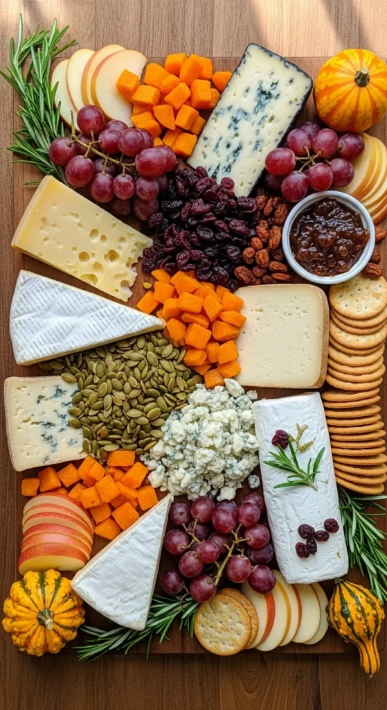 A Holiday Harvest Cheese Board celebrates the flavors of fall and winter with cheeses like aged gouda and goat cheese, paired with roasted pumpkin seeds, dried cranberries, and sliced squash. The rich seasonal colors and flavors will bring a cozy, harvest-inspired feel to your Christmas party.