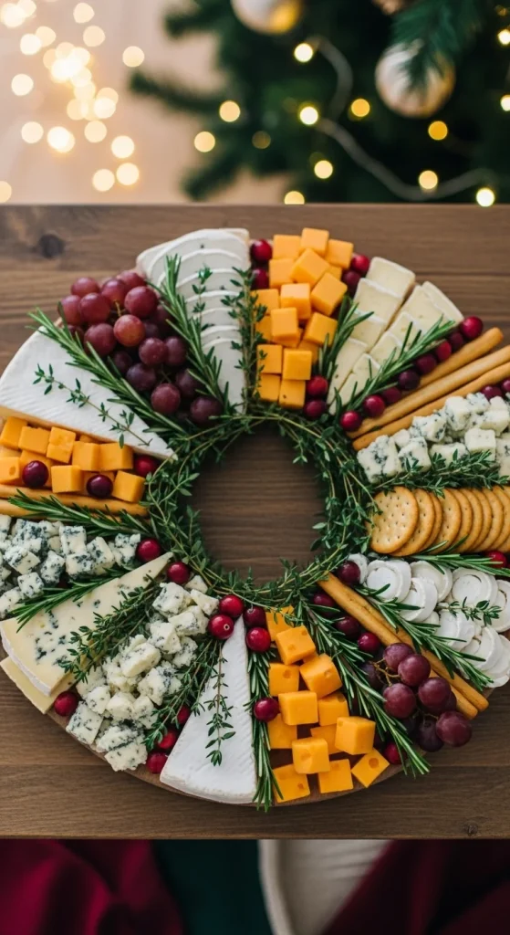 Create a wreath-shaped board filled with an assortment of cheeses, fresh herbs like rosemary, and holiday accents such as red berries and pomegranate seeds. The shape alone will catch your guests’ attention, making it a beautiful centerpiece. Offer a selection of crackers and fresh bread for a perfect bite.