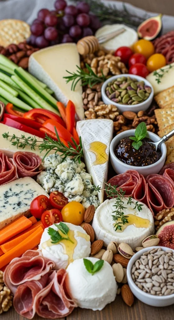 For a lighter, more vegetarian-friendly cheese board, incorporate a variety of fresh vegetables like cucumber, carrot sticks, and grape tomatoes. Pair them with cheeses such as cream cheese, ricotta, and mozzarella. Add some seeds and nuts for extra crunch, making this a refreshing option for your guests.