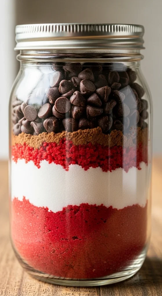 For a holiday-inspired treat, create a red velvet cookie mix. Layer red velvet cake mix, flour, sugar, and chocolate chips in the jar. When baked, these cookies are rich, soft, and have the signature red color, perfect for a fun, festive gift.