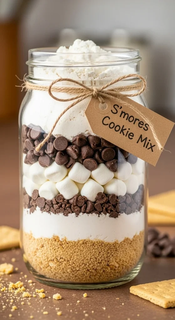 S’mores cookies capture the essence of the classic campfire treat. Layer graham cracker crumbs, chocolate chips, and mini marshmallows in the jar. This mix gives the recipient everything they need to bake gooey, chocolate-filled cookies reminiscent of a cozy campfire.