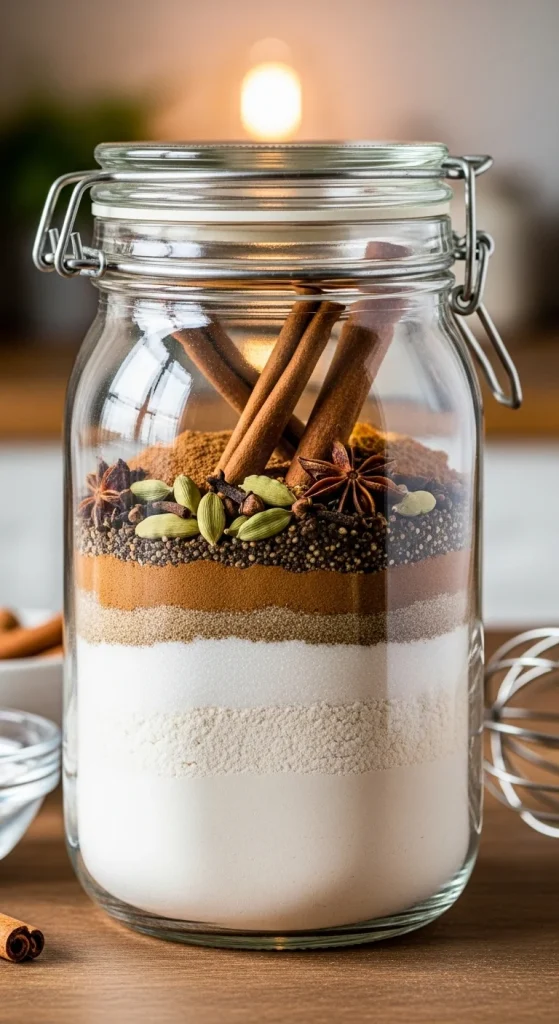 For a spiced twist on snickerdoodles, create a chai-spiced snickerdoodle cookie mix. Layer cinnamon, ginger, cardamom, and cloves with sugar and flour in the jar. These cookies capture the warming, aromatic flavors of chai tea, perfect for winter celebrations and a cozy holiday snack.