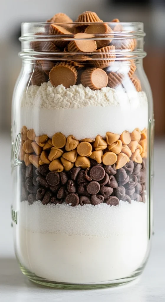 A peanut butter cup cookie mix is sure to be a favorite. Layer peanut butter chips, mini peanut butter cups, and chocolate chips in the jar for an indulgent cookie that combines the sweetness of chocolate with the savory richness of peanut butter. These cookies are a perfect gift for anyone who loves this classic flavor combo.