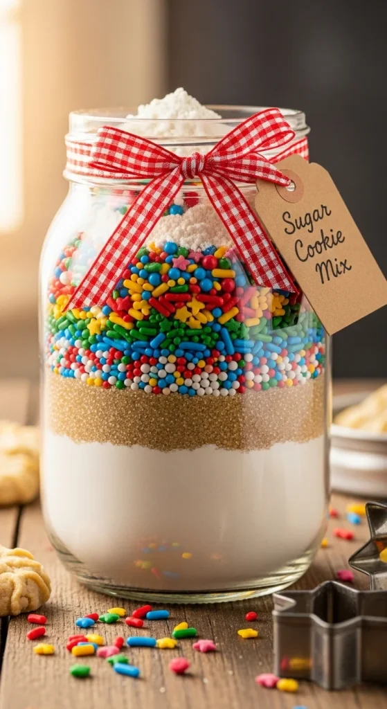 Sugar cookies are a classic holiday treat. Fill the jar with flour, sugar, baking powder, and a generous portion of colorful sprinkles. The recipient can add butter and eggs before rolling the dough in sprinkles to create festive, crisp-edged cookies perfect for holiday decorating.