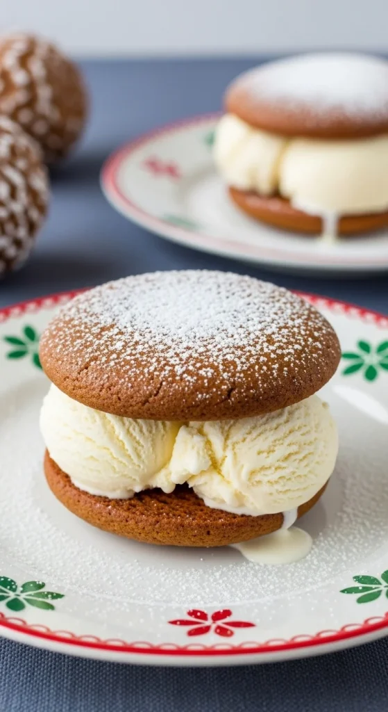 Gingerbread ice cream sandwiches are a fun and cool way to enjoy the flavors of gingerbread. Soft gingerbread cookies are filled with vanilla ice cream, creating the perfect balance of spicy and creamy. Dust with powdered sugar for a beautiful holiday presentation.