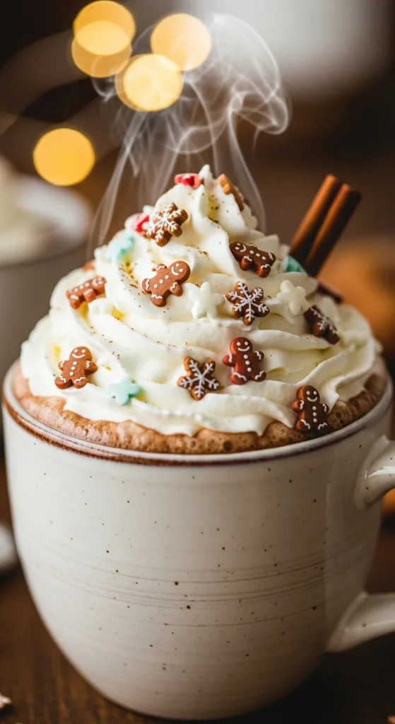 For a warm, cozy dessert, gingerbread hot chocolate is perfect for chilly evenings. Infused with the warming spices of gingerbread, this rich hot chocolate is topped with whipped cream and a sprinkle of cinnamon. It’s the ultimate holiday comfort drink.