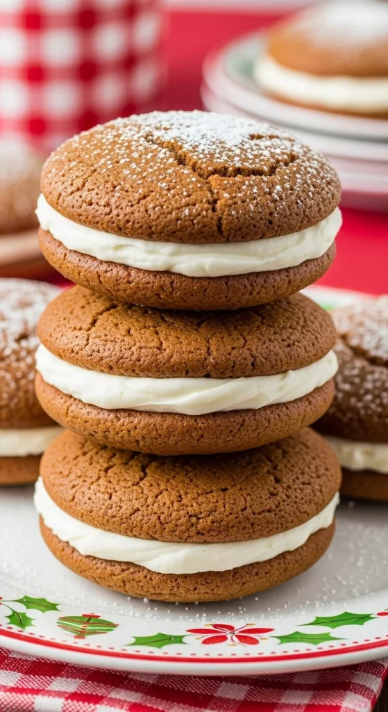 Gingerbread whoopie pies are a fun and festive twist on the classic whoopie pie. Soft gingerbread cookies are sandwiched together with a creamy, tangy filling. These bite-sized treats are perfect for holiday parties and make for a delightful gift as well.
