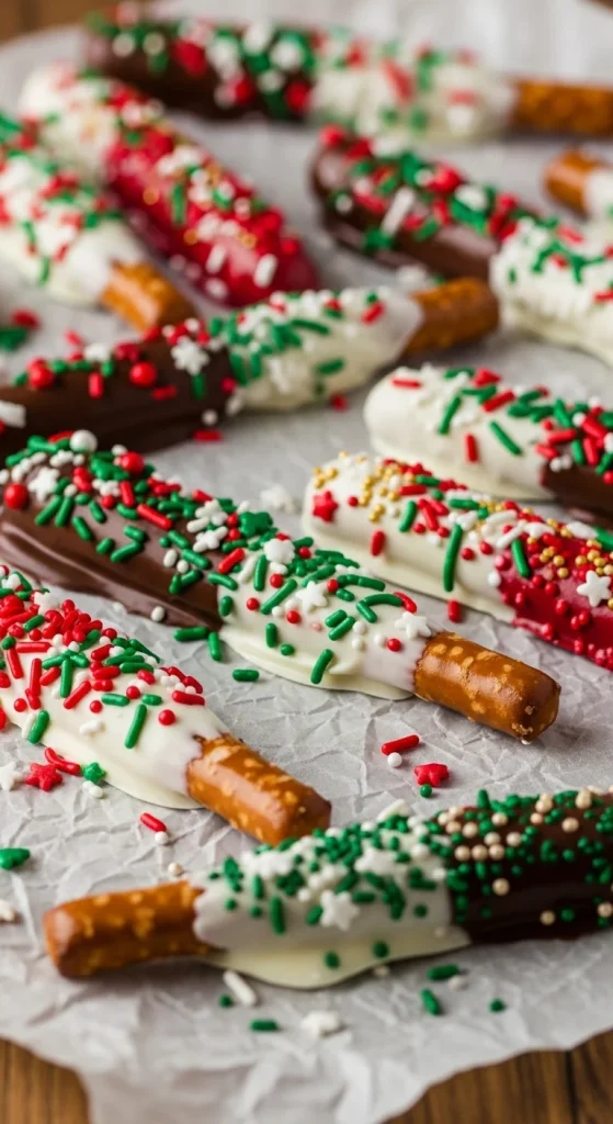 Dip pretzels into melted chocolate and decorate with crushed candy or sprinkles. Let them harden before wrapping in cellophane bags. It’s quick, inexpensive, and colourful — great for kids to help make.