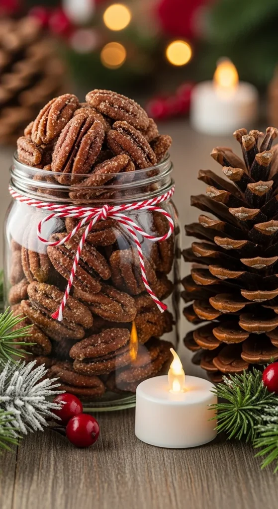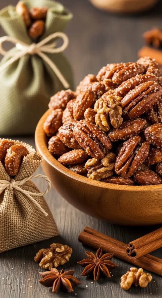 Toss mixed nuts with egg white, sugar, and warm spices like cinnamon or nutmeg. Roast until crisp. Cool completely before packing in jars or bags. Great for snacking and easy to prepare ahead. Add a note that says “Perfect for movie nights.”