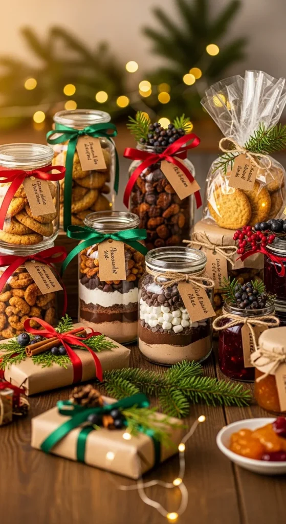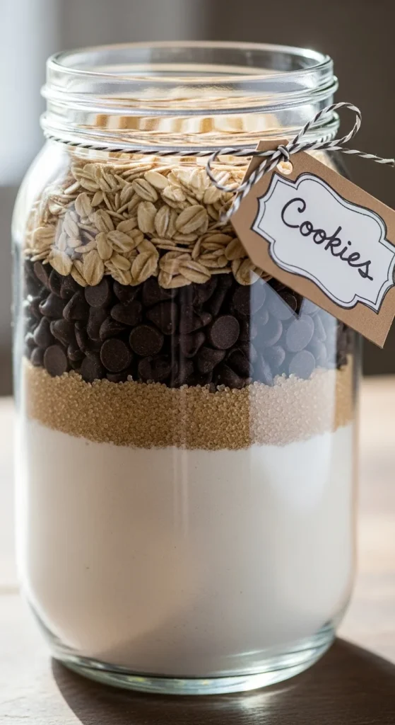 Layer dry ingredients for cookies in a clear jar. Attach a tag with wet ingredient instructions. It’s interactive and fun for the recipient to bake later. Choose classic chocolate chip or oatmeal for universal appeal.