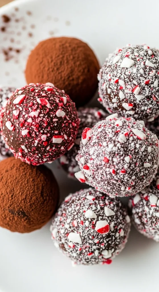 These truffles look fancy but take minutes to make. Mix melted chocolate with coconut cream, chill, then roll into balls. Coat with cocoa or crushed candy canes. Store in the fridge — they make great edible gifts too.