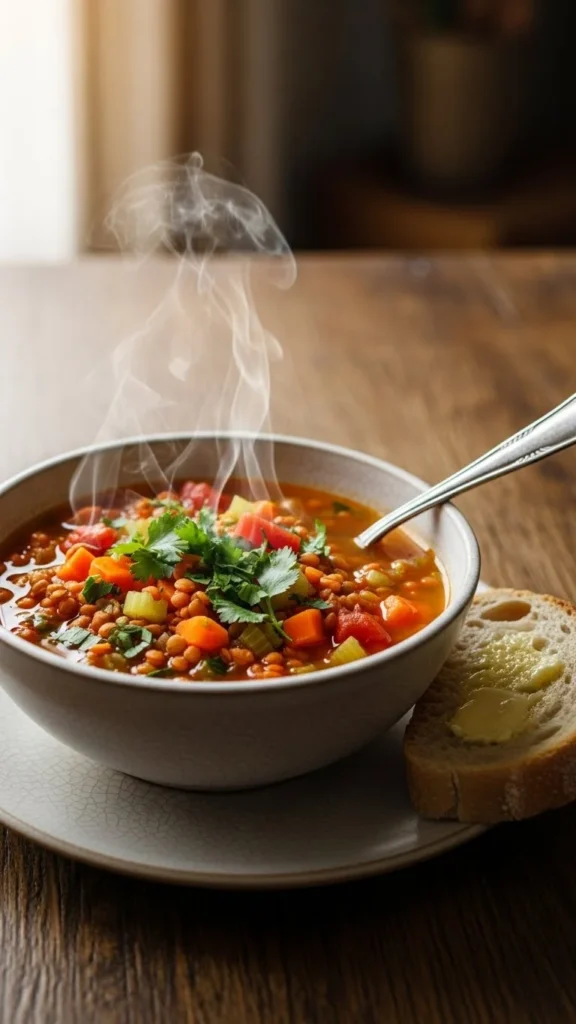 Lentil soup keeps you full without heavy ingredients. Add onions, carrots, celery, and garlic to a pot. Stir until soft. Add lentils, stock, and canned tomatoes. Let everything simmer until the lentils soften and the broth thickens. This soup works well for meal prep because it stores and reheats easily. Use dried lentils for a lower-cost option. Add spinach near the end for colour. Serve with wholegrain bread or crackers. Freeze leftover portions in small containers so you always have a warm, healthy meal ready on busy nights.