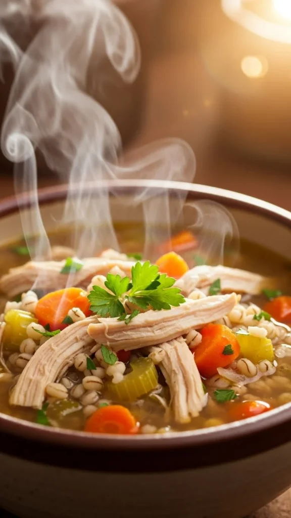 Barley keeps soups hearty and filling. Simmer chicken with onions, carrots, celery, and barley until everything softens. Barley thickens the broth and adds gentle texture. Use rotisserie chicken if you want to save prep time. This soup stays firm in the fridge and reheats well, making it ideal for meal prep. Add a squeeze of lemon before serving for brightness.