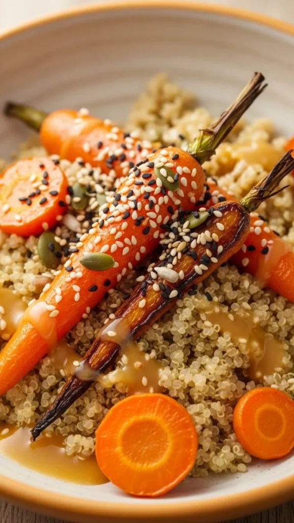 Roasted carrots pair well with ginger. Cook quinoa and set aside. Roast sliced carrots with oil and garlic until caramelised. Mix a simple dressing of grated ginger, lemon, and a small spoon of honey. Combine everything in a bowl and sprinkle seeds on top for crunch. This dish feels warm and energising without heavy additions. Use multi-colour carrots for visual interest.