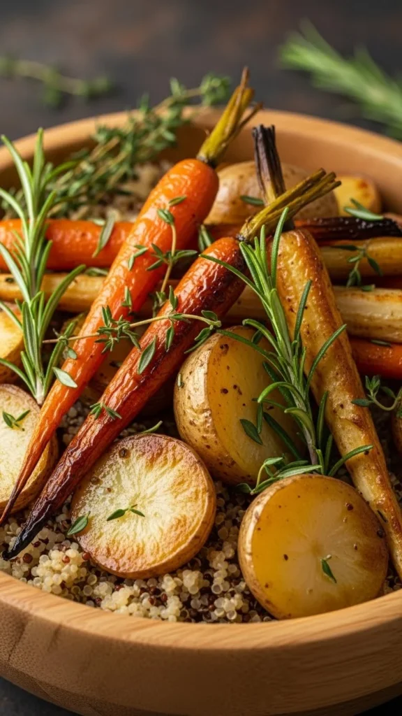 Root vegetables roast well and carry deep flavour. Slice carrots, potatoes, parsnips, and onions. Toss with oil, salt, and pepper. Roast until golden and crisp at the edges. Serve over quinoa or brown rice. Add chickpeas for extra protein. This bowl works well for winter meal prep because roasted vegetables store nicely for days and reheat without losing texture.