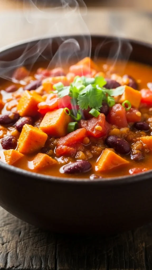 This chili feels hearty but stays light. Cook onions and garlic, then add diced sweet potatoes, beans, tomatoes, and mild spices. Let everything simmer until the sweet potatoes soften and the flavours settle. Sweet potatoes add natural richness without heavy ingredients. Use canned beans to save time. Add corn for extra texture. Serve with brown rice or simple tortillas. This recipe freezes well and tastes even better the next day. Keep it mild or add chilli flakes for a soft kick.