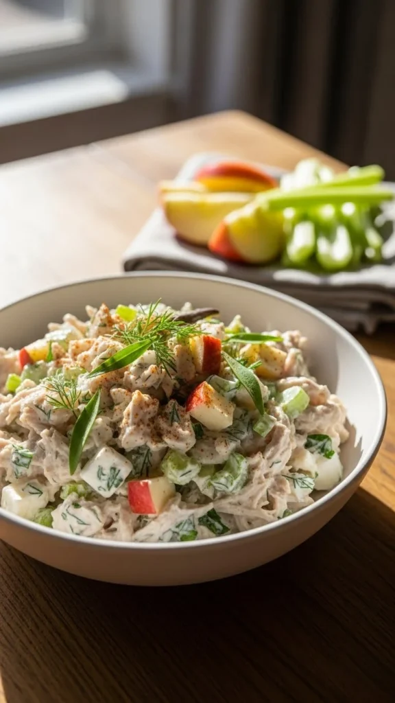 This chicken salad feels light but keeps you full. Mix shredded chicken with Greek yogurt, diced celery, apples, and herbs. Season lightly. Serve in wraps, bowls, or stuffed inside wholegrain bread. This mixture stores well and makes a good grab-and-go lunch. Use store-brand yogurt to keep costs low. Add walnuts for crunch if you like.