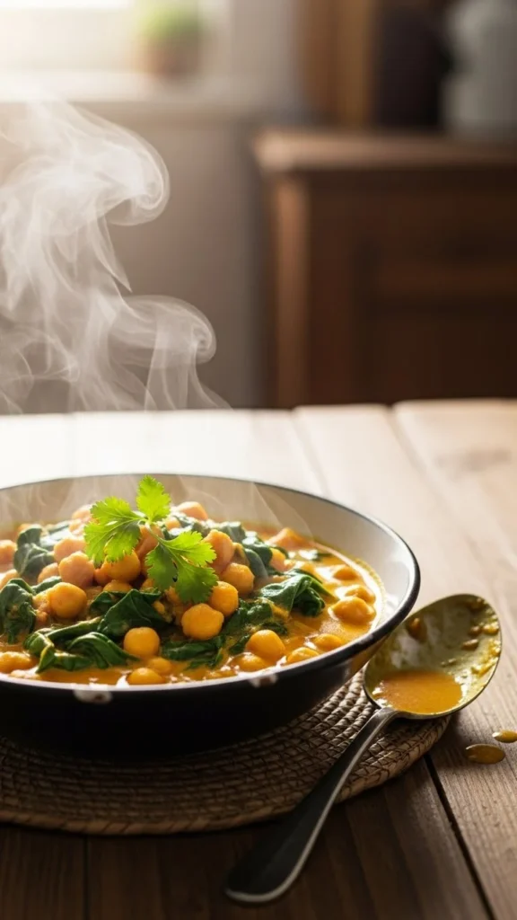 This curry uses pantry items but tastes warm and rich. Simmer onions with garlic, add chickpeas, tomatoes, and coconut milk. Let it thicken slightly. Add spinach at the end. Serve with rice or quinoa. This meal comes together fast and carries strong, comforting flavours without feeling heavy. Use canned chickpeas to save time. Make a double batch so you have leftovers for lunches throughout the week.