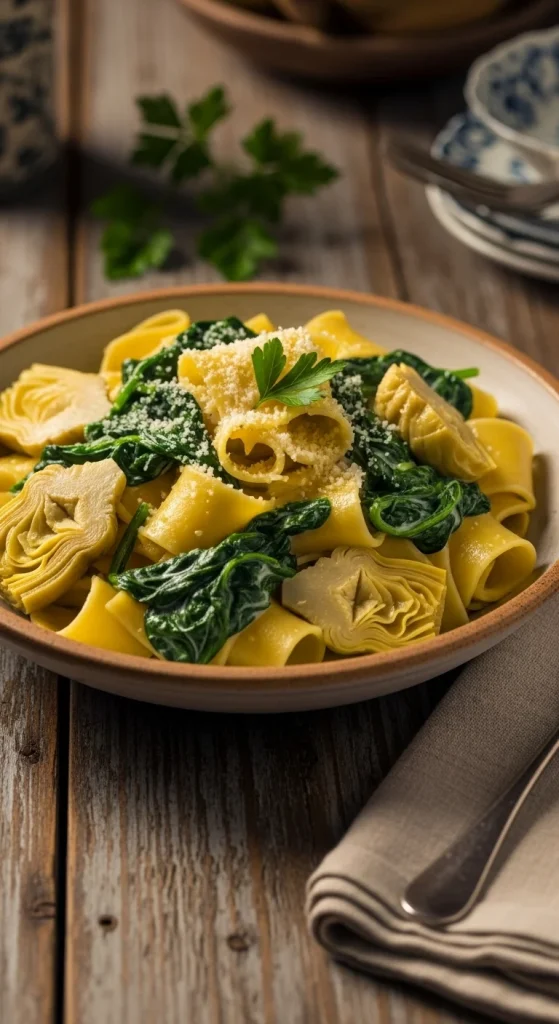 Spinach and artichoke sauce pairs well with pasta. Use jarred artichoke hearts for convenience. Mix with cream cheese or a little cream to make a smooth sauce. Add spinach and stir until wilted. Toss with pasta and serve warm. This dish cooks quickly and feels comforting without complicated steps.