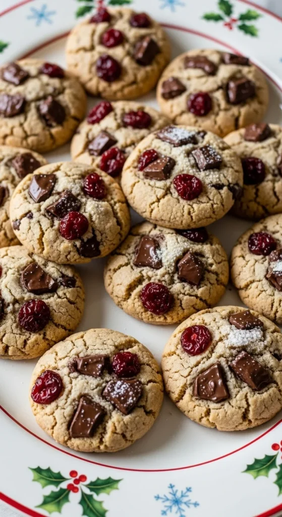 Cherry chocolate chunk cookies are filled with dried cherries and rich chocolate chunks, creating a delicious combination of sweet and tart flavors. These cookies are a unique addition to any holiday cookie platter, and you can print out the recipe to share with friends for a fun and festive bake.