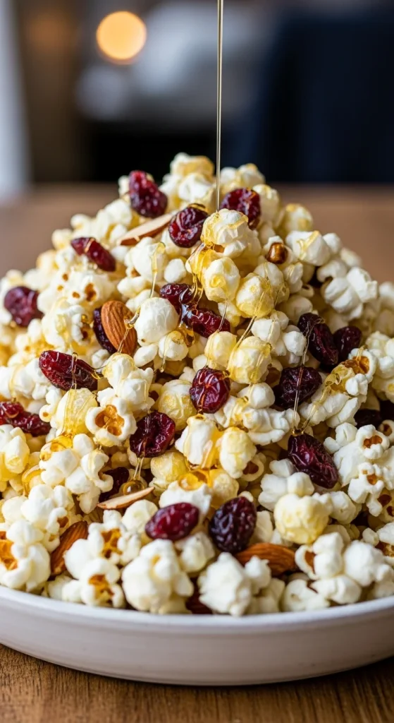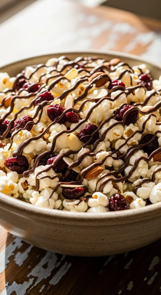 For a slightly tart and nutty twist, try cranberry almond popcorn. Mix dried cranberries, sliced almonds, and freshly popped popcorn for a crunchy snack. Drizzle with a touch of honey to add sweetness, and you’ll have a festive, healthy snack everyone will enjoy.