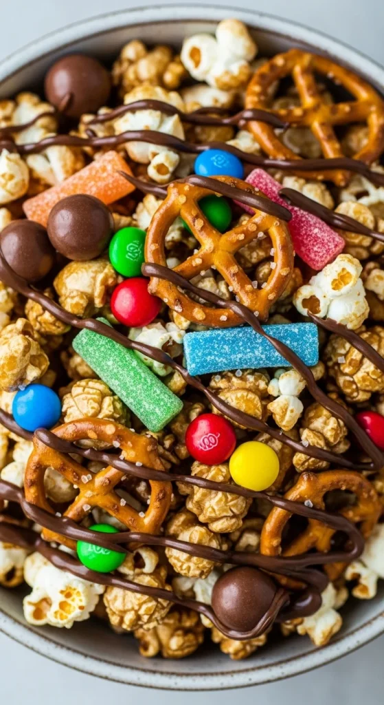 Create a snack that’s both salty and sweet with pretzel popcorn mix. Add mini pretzels to your popcorn, drizzle with chocolate, and top with holiday M&Ms or colorful candies. This fun, crunchy snack is perfect for sharing during your next holiday party.