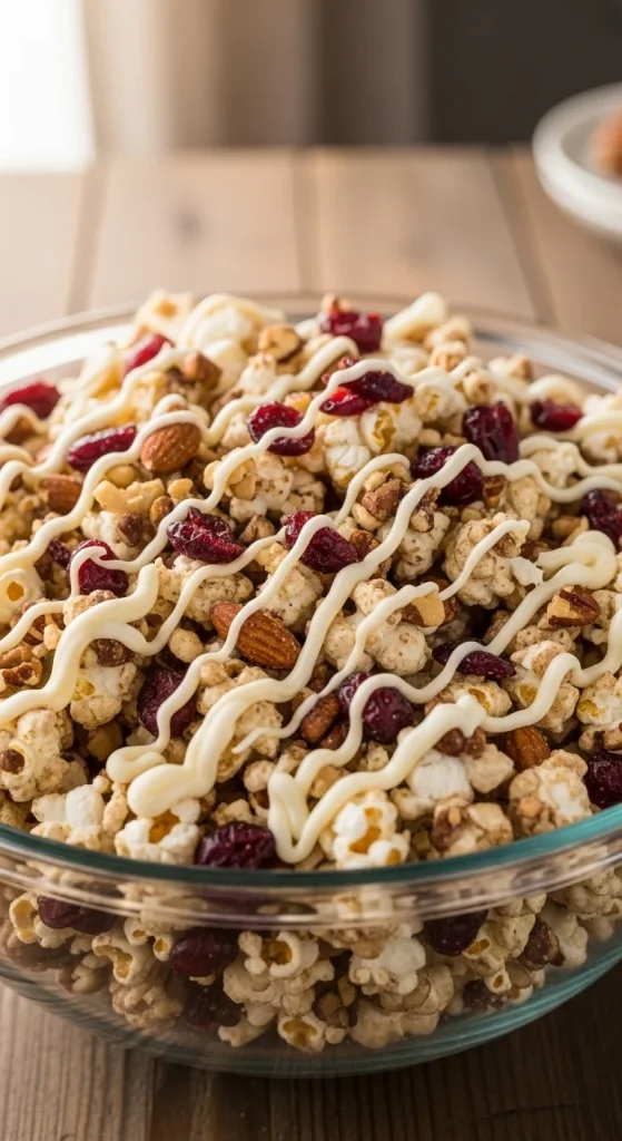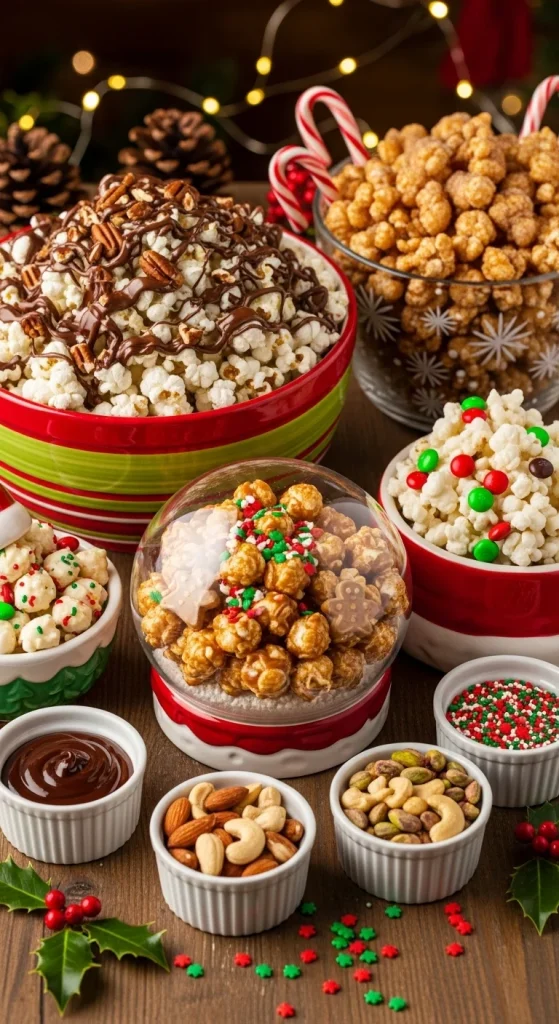 For a festive touch, try white chocolate cranberry popcorn. Drizzle melted white chocolate over popcorn and top with dried cranberries and a handful of chopped nuts like pecans or almonds. This combination of sweet and tart flavors will be a hit at your holiday gatherings!