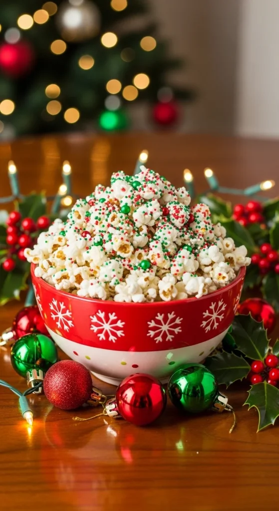 For a fun and colorful snack, holiday sprinkle popcorn is always a hit. Drizzle white chocolate over popcorn and then top with holiday-themed sprinkles like red, green, and gold. This playful snack adds a festive touch to any gathering and is sure to bring smiles to the faces of kids and adults alike.