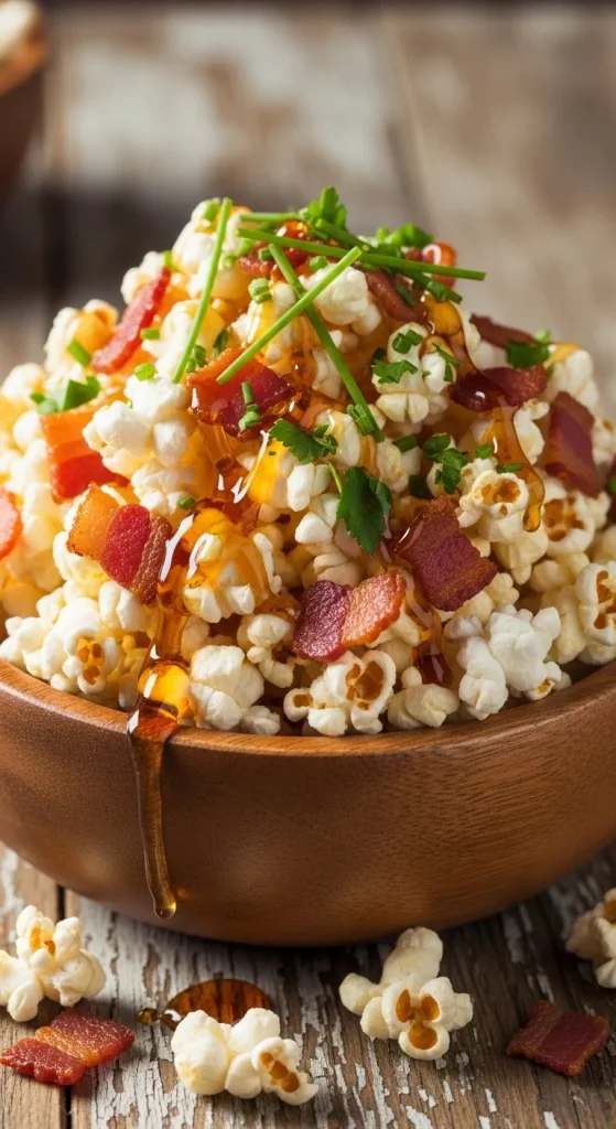 For a savory-sweet combo, try maple bacon popcorn. Toss crispy bacon bits and a touch of maple syrup with freshly popped popcorn. The sweetness of maple syrup and the savory crunch of bacon create a unique and bold flavor. Perfect for those who prefer a salty-sweet snack during the holidays!