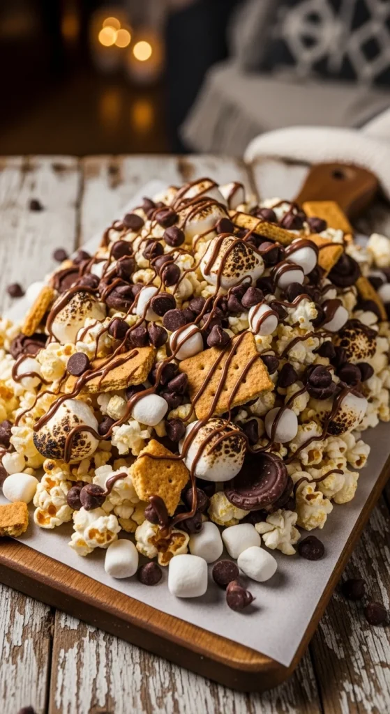 S’mores popcorn is the ultimate indulgence. Drizzle chocolate syrup over the popcorn, then top with mini marshmallows and crushed graham crackers. The combination of sweet chocolate, gooey marshmallows, and crunchy graham crackers captures all the best parts of s’mores in every bite.