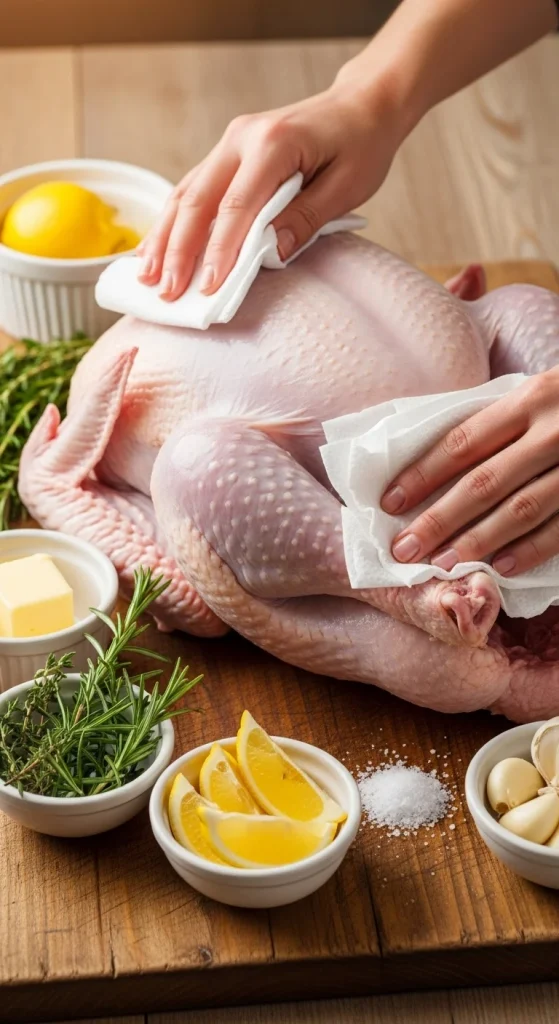After brining, remove the turkey and rinse it well under cold water to wash away excess salt. Then pat it completely dry with paper towels — this is key for crispy, golden skin.