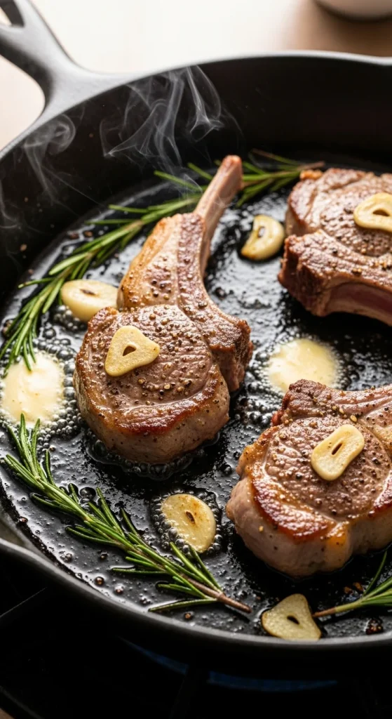 3. Sear lamb chops for 3–4 minutes per side, depending on thickness.