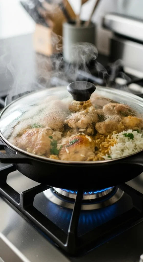 - Check occasionally — the rice should absorb all the liquid and turn fluffy, and the chicken should be cooked through (165°F internal temperature).