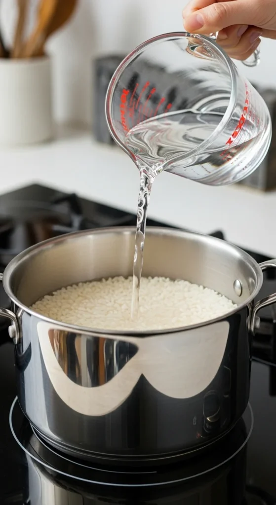 • White rice: 1 cup rice to 1.5–2 cups water.