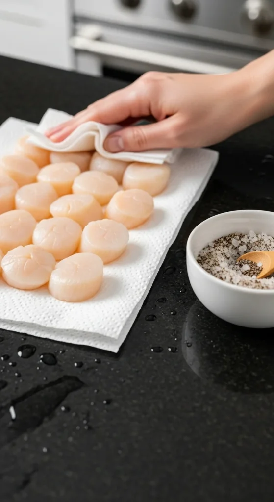 1. Pat dry with paper towels. Moisture is your enemy when searing — dry scallops give you that signature golden crust.