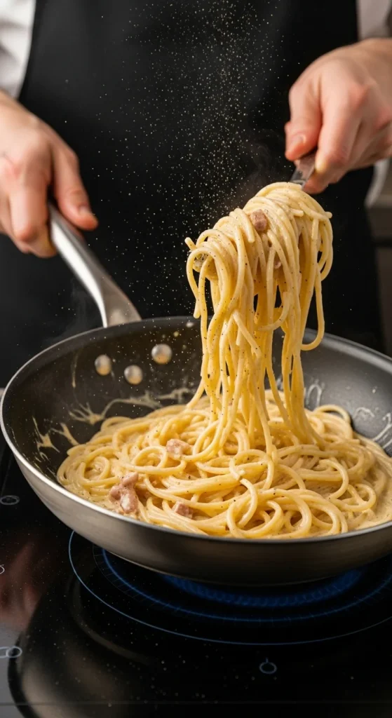 Here’s where you become a pasta legend. The key is temperature control — too hot, and you’ll scramble the eggs; too cool, and it won’t emulsify.